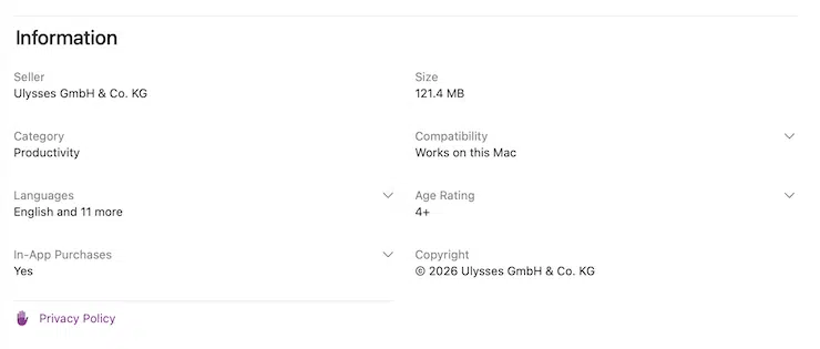 A continuación, vea un ejemplo de derechos de autor de Ulysses, una aplicación integral de escritura alojada en el App Store de Apple.