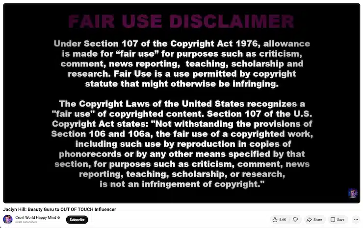 Forse il disclaimer più comune aggiunto ai video di YouTube è quello relativo all'uso corretto che, ai sensi della sezione 107 della legge sul copyright, consente l'uso senza licenza di materiali protetti da copyright per scopi quali: