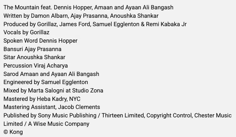 Nello screenshot qui sotto, si può vedere ancora una volta in parte come il gruppo musicale Gorillaz includa delle dichiarazioni di non responsabilità nei video musicali del loro ultimo album, The Mountain, che è stato di natura collaborativa.